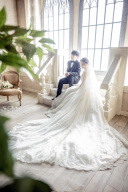 チャペルの大きな窓の前でカラートーンも一体となって神聖な世界観の撮影へ!