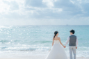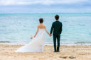 今回は前撮りでお越しでしたから、披露宴の予定日を砂浜に書いて空撮します。楽しそうに描くお二人に私たちも自然に笑顔に。