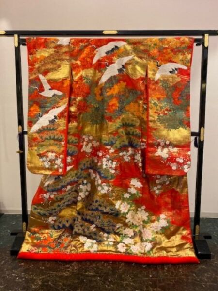 赤オレンジ地に描かれた雲の中に様々な小花で優しい雰囲気。 優雅な美しさと舞う鶴の白さがストーリー性を感じさせる打掛。