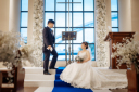 海へと続くような青いバージンロードを一歩ずつ進みアーチ型の窓いっぱいに海の眺めが広がる祭壇で誓いのお写真を撮影することも*