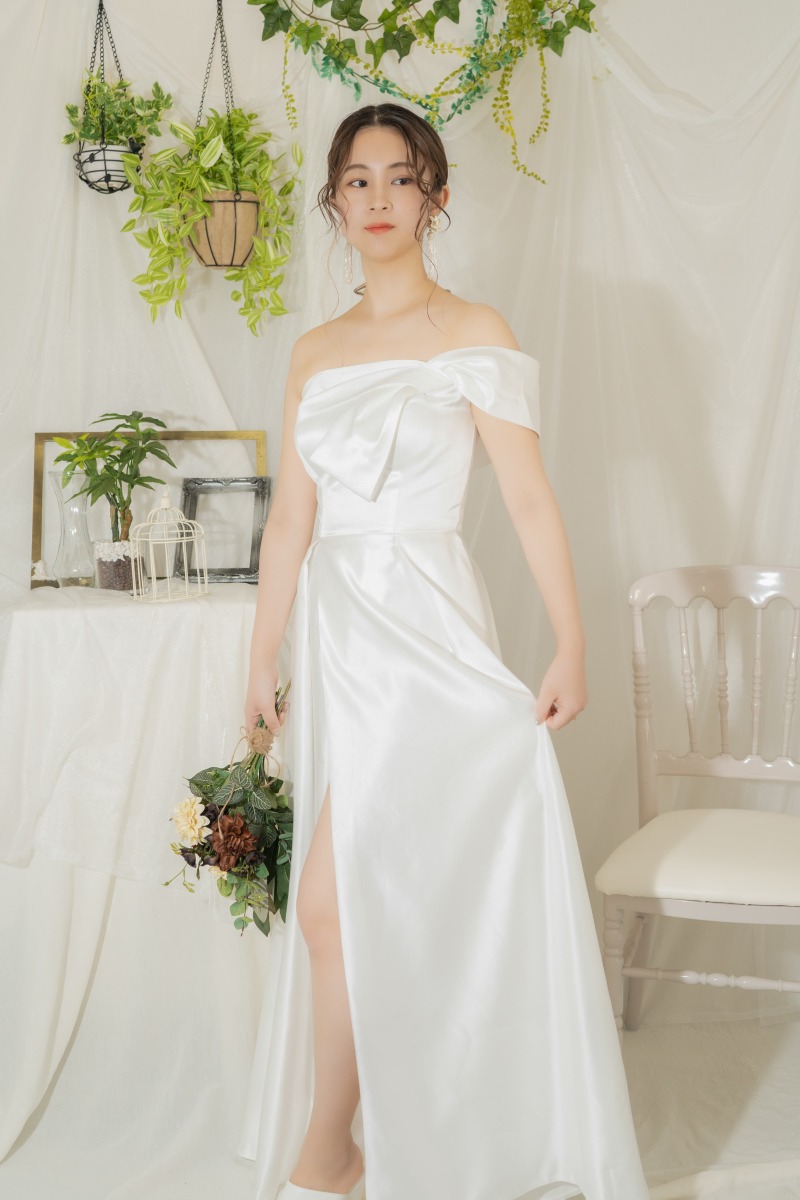 サテン生地のワンショルダースリットの高さは調整可能です。インナーはヌーブラが◎