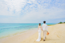 淡く透き通った海をバックに手を取り合うお二人。ロマンティックな一枚♡