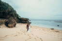 青い海と青い空を眺めながら、海に向かって歩く二人の後ろ姿を撮影♪
