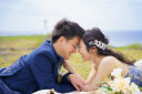 海をバックにみどりを入れて鮮やかに。ハグするお二人の密着フォト♡♡