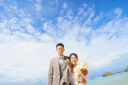 沖縄らしく青い海をバックに撮影!ブーケも映えて素敵な1枚になりました!