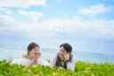 砂浜に座って休憩タイム。遠くを見つめるお二人をシックにエモく♡