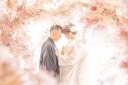 光壁の前で番傘スタイル!光もおふたりを祝福しています!