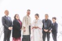 新婦様はレースハットにフレアなお袖をプラス+新郎様もストールにサングラスと個性あふれるおしゃれコーデ!レースのフレアなお袖は実は…新婦様手作りですっ!