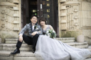 趣のある街並みにオリエンタルグリーンのタキシードとウエディングドレスがとてもマッチしてます。