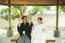 縁側でのオフショット。和室の前には日本庭園が広がり風情ある景観が楽しめます。