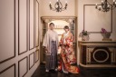 "天井に広がる日本画に、神秘的な梅のお花和のテイストに広がるグレージュのドレスがエモーショナルさを引き立たせます"
