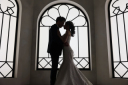 シックな背景の前でお二人の目線を外してエレガントな雰囲気を演出。