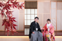 和装に身を包み、正座での一枚。黒い紋付と赤い打掛の色合いが絶妙ですね。