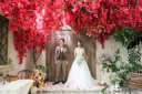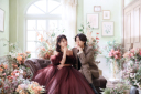 寄り添いながら、遠くを見つめる和のスタイルが際立つカットですね。手に持ったブーケもとても魅力的です。
