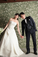 ご結婚の報告や、年賀状に最適なポーズです。華やかな衣装が一層の明るさを引き立ててくれますね。