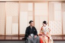 和装を身にまとい、手を取り合った二人の姿は、まるで和装の結婚式のようです。後ろには藤の花が咲き誇り、まるで祝福しているかのようですね。