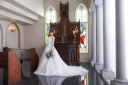 花の彩りに溶け込むように佇むご新婦様。ブーゲンビリアが引き立てる上品で美しい瞬間。