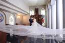 豪華な格天井と行燈の光が織りなす、格調高い一枚。綿帽子を纏った新婦様のシルエットが空間に美しく溶け込み、伝統の重みを感じさせるダイナミックな構図です。
