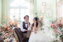 パステルカラーの花々に囲まれた、洋風和装のミキシング。白無垢の小物に差し色を取り入れた新婦様のコーディネートに合わせて、柔らかく多幸感溢れる光で撮影いたしました