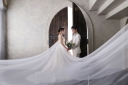 にこやかな写真も多く撮影する中、クールな表情も残されたおふたり。トレーンの流れる雰囲気も、ご新郎様のタキシードも、トータルでコーディネートされた1枚ですね♪