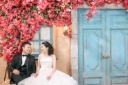 ブーゲンビリアが咲く街並みでデートの様子を。ブーゲンビリアの花言葉は『あなたしか見えない』。