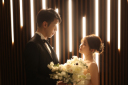 パープルの空間にやさしく溶け込むピンクのドレス。その柔らかな色の重なりが、甘さの中に大人っぽさも感じさせる、おふたりだけの洗練された世界観に。