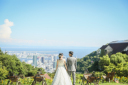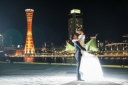 夕日のライトアップで、新婦の輝く笑顔を写真におさめます