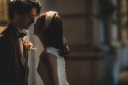 見つめあう新郎新婦とカラフルな傘が印象的な1枚です