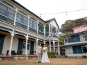 石造りの建物の前を歩くふたりの姿が絵になる新郎新婦の姿が素敵です