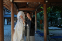 綺麗な緑色の松並木を仲良くお散歩している雰囲気の一枚です。