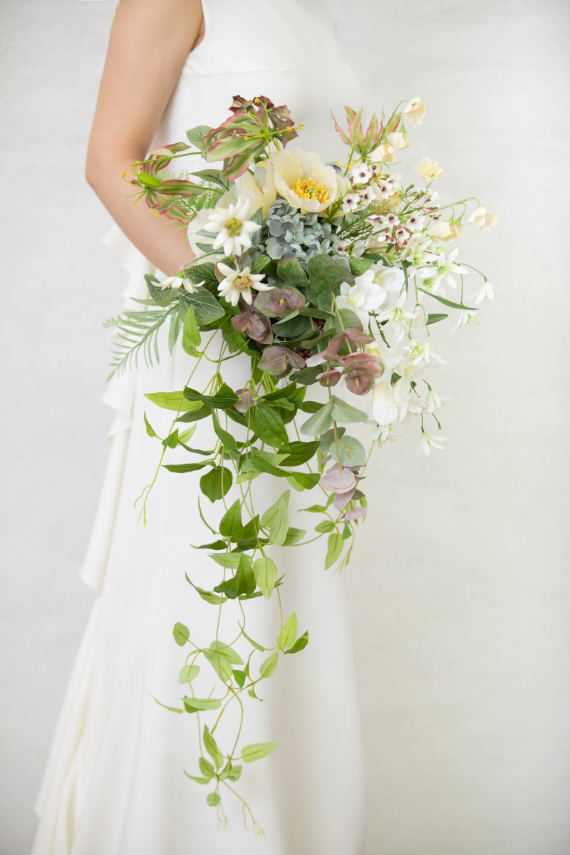 グリーンの流れが下にデザインされたキャスケードブーケ。生花と見違えるほどのクオリティー。背の高い人や大柄な人にもよく合い、遠くからでも美しく映えます。また、縦のラインが協調されスタイルアップ↑シンプルなスカートのデザインにエレガントで素敵。