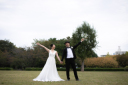 手を繋いでラフなショット。お茶目な新郎様は足を上げて、お二人はいい笑顔。