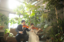 四季を問わず光が入る明るい温室でのショット。植物たちにとって心地よい環境は、私たち人間にも快適な場所。心からリラックスできる大空間でのびやかな1枚を残せました。