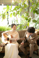 パパのブートニアをママへ♡お花をプレゼントしているみたいでとってもかわいいです!!ママも喜んでくれてよかったね♡