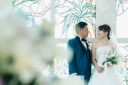 宮古島の植物が施されたステンドグラスが特徴のアラマンダチャペル。お二人お選びになった真っ白の衣装がすごく映えますね♪