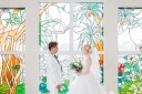 アラマンダチャペルといえばステンドグラス!お二人のさわやかな笑顔が柔らかい雰囲気をだしている1枚ですね♪