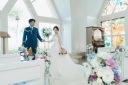 新郎様から新婦様へプレゼントシーン。お2人でやさしく花束を見つめる姿が素敵です♪