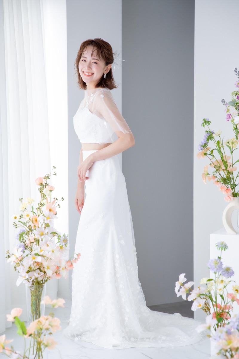 ウエストがすっきり空いたドレス。袖付きが嬉しい繊細なスリーブがおしゃれなウェディングドレスです。歩くたびに広がりが変わるので前撮りではいろんな表情を見せてくれる衣装です。前撮りは少し背伸びして衣装を選ぶこともOK。☆無料でご試着可能です☆