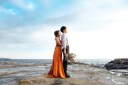 夕暮れの江ノ島をバックにドランチックな写真です。心地よい風も吹いていてロングベールが幻想的に靡く写真がお撮り出来ました。
