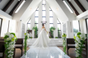 白と直線のチャペルに、白×グリーンのチャペル装花。そこに差し色のように華やかで大人っぽいカラーの衣裳のお二人…。お二人の存在感が際立つウェディングフォトに…