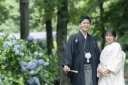 紫陽花が咲く道で…大ぶりの髪飾りとブーケも負けていません