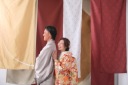 この日最初のカット。王道のお二人立ち姿カットから。お二人の要望でツートーンカラーの背景で。