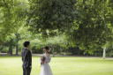 ご新婦様のブーケとお揃いのブートニアを付けたご新郎様のソロカット。カーキのタキシードが公園の緑と調和してとても綺麗です。