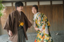 桜に囲まれた縁側にてお話するお二人。 一緒に乾杯しない?