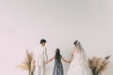 新郎さまに寄り添う新婦さま。仲良く手を繋いでいるところを撮影しました。
