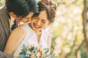 日が少し沈んできた頃の1枚。山肌に日が重なり幻想的な光のベールが。おふたりの衣裳にぴったりなブーケがまた一段と写真を素敵な印象にしてくれました。