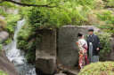 四季を映す緑に囲まれ、ゆったりと歩むふたりの姿は、まるで時がゆっくり流れるよう。自然体の笑顔に溢れた、穏やかな和装前撮りです。
