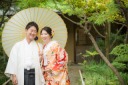 目白庭園ならではの和の情緒と自然の美しさ。黒紋付と色打掛のふたりが織りなす景色は、まるで物語の一場面のように印象的です。
