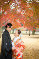 秋の前撮りは和装に紅葉…だけじゃない!ドレスとタキシードにも黄色く色づいた木々はぴったり。