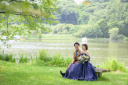 池に反射するおふたりの姿。色鮮やかなお衣装がはっきりと映し出されています。